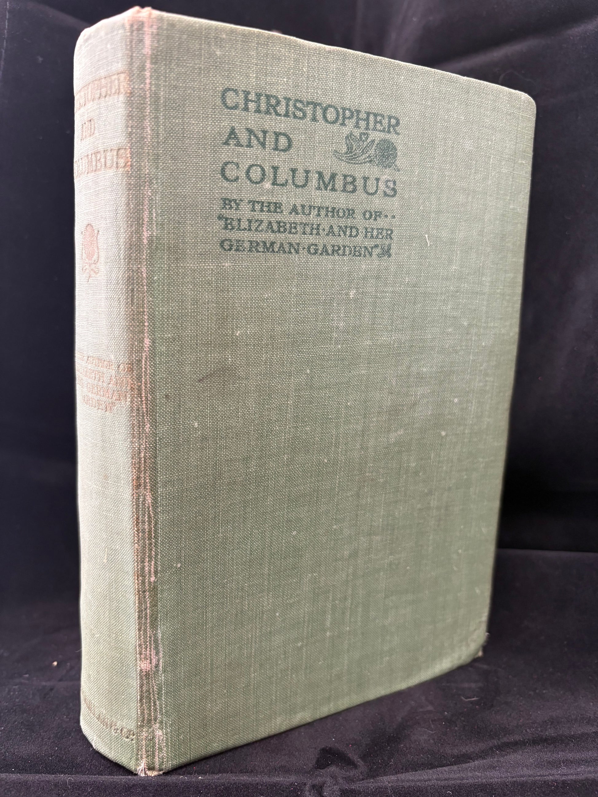 Von Arnim, Elizabeth. Christopher and Columbus 1919. Macmillan and Co. Second Edition. Very Good Condition. Firm binding, bumped extremities. Top and bottom of spine slightly scuffed. Inscription on flyleaf.